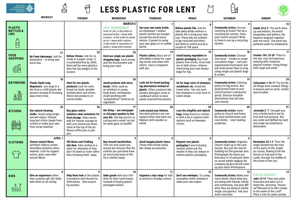 Giving up plastic for Lent Here’s a calendar from the Green Anglicans organization with an environmental twist: instead of giving up chocolate, how about giving up something to help the earth? Plastic-Calendar (click for a printable copy) Share this:TweetLike Loading... Related