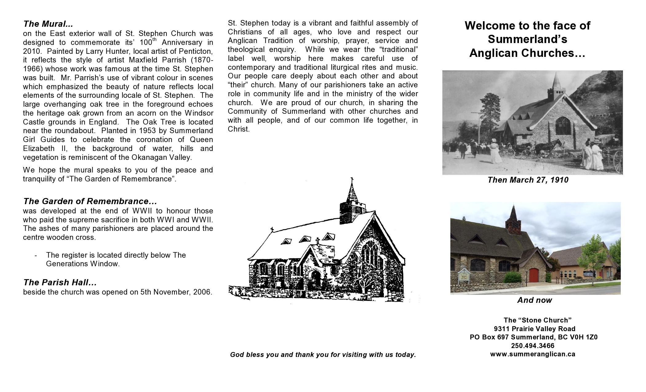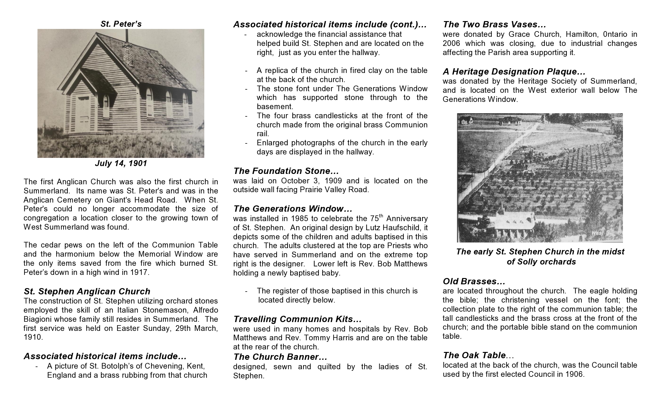 In the last decade of the 1800’s the earliest white settlers were being served by the Rev. Thomas Greene, itinerant Anglican priest. St. Peter’s Church was built on the site of the present Anglican cemetery on Giant’s Head Road in Summerland. The Rev. H.A. Solly came in 1907 as the first resident rector. Owing to overcrowding and the need for a central location, the cornerstone for St. Stephen’s Church was laid on October 3, 1909. Services began there March 27, 1910. The distinctive exterior of the church is of native fieldstone, now ivy-clad.
